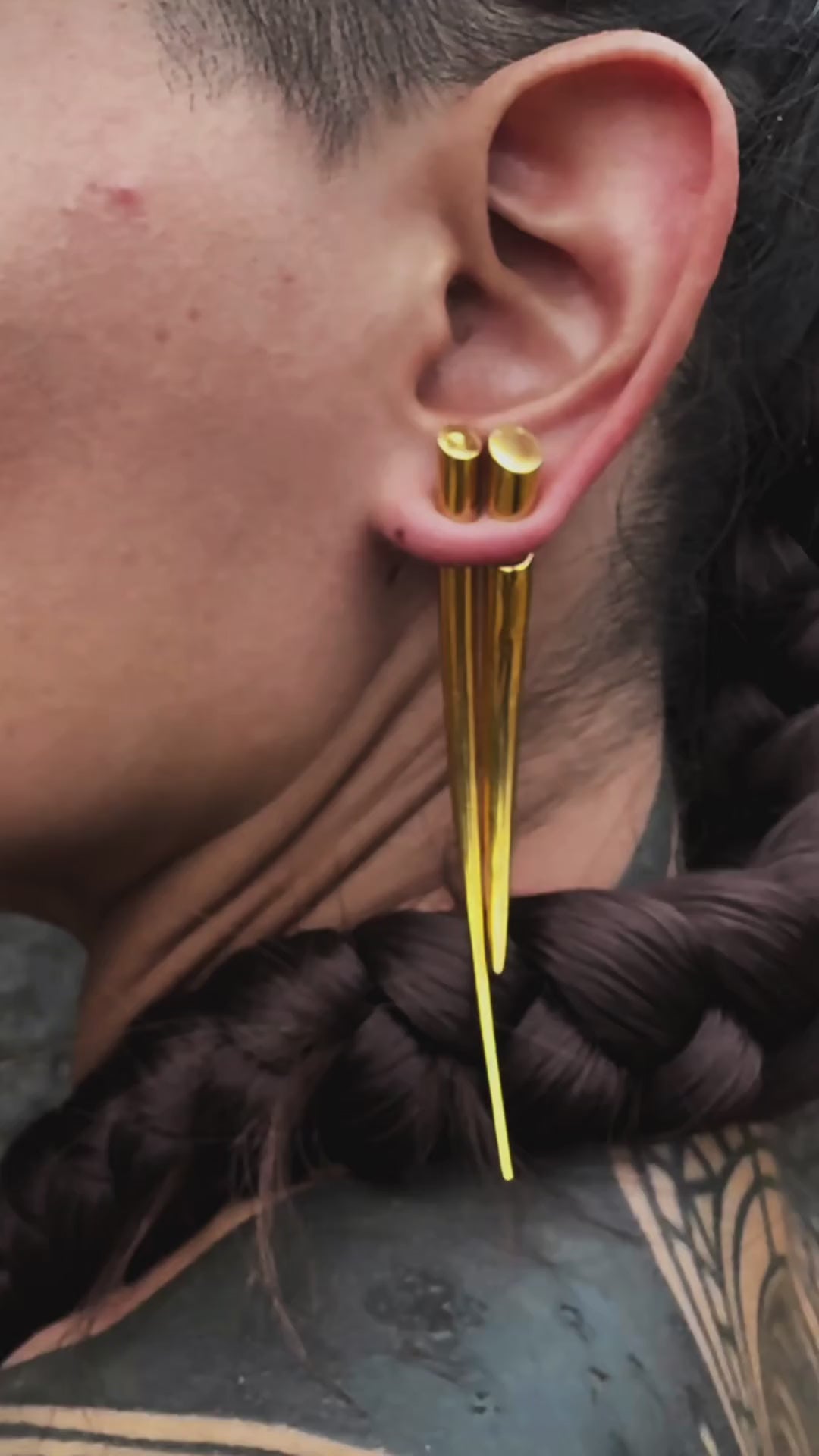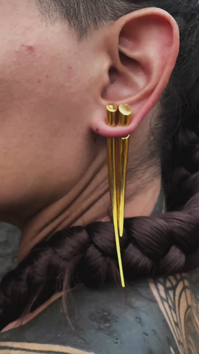Their elongated silhouette, available in sizes from medium to extra long, creates a powerful profile that can be worn as a subtle accent or a daring statement piece. The warm golden tone enhances their sculptural form, catching the light with every move while keeping their roots in the raw authenticity of tribal gauge jewellery.