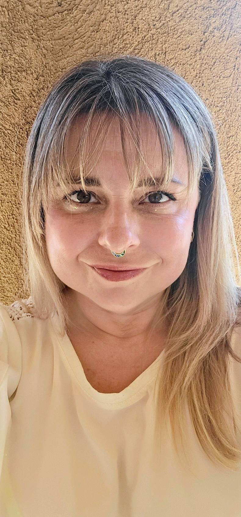 The Aanya Septum Ring blends organic beauty with clean, modern design. Its smooth crescent silhouette is inlaid with your choice of natural shell, each bringing its own mood and quiet magic: