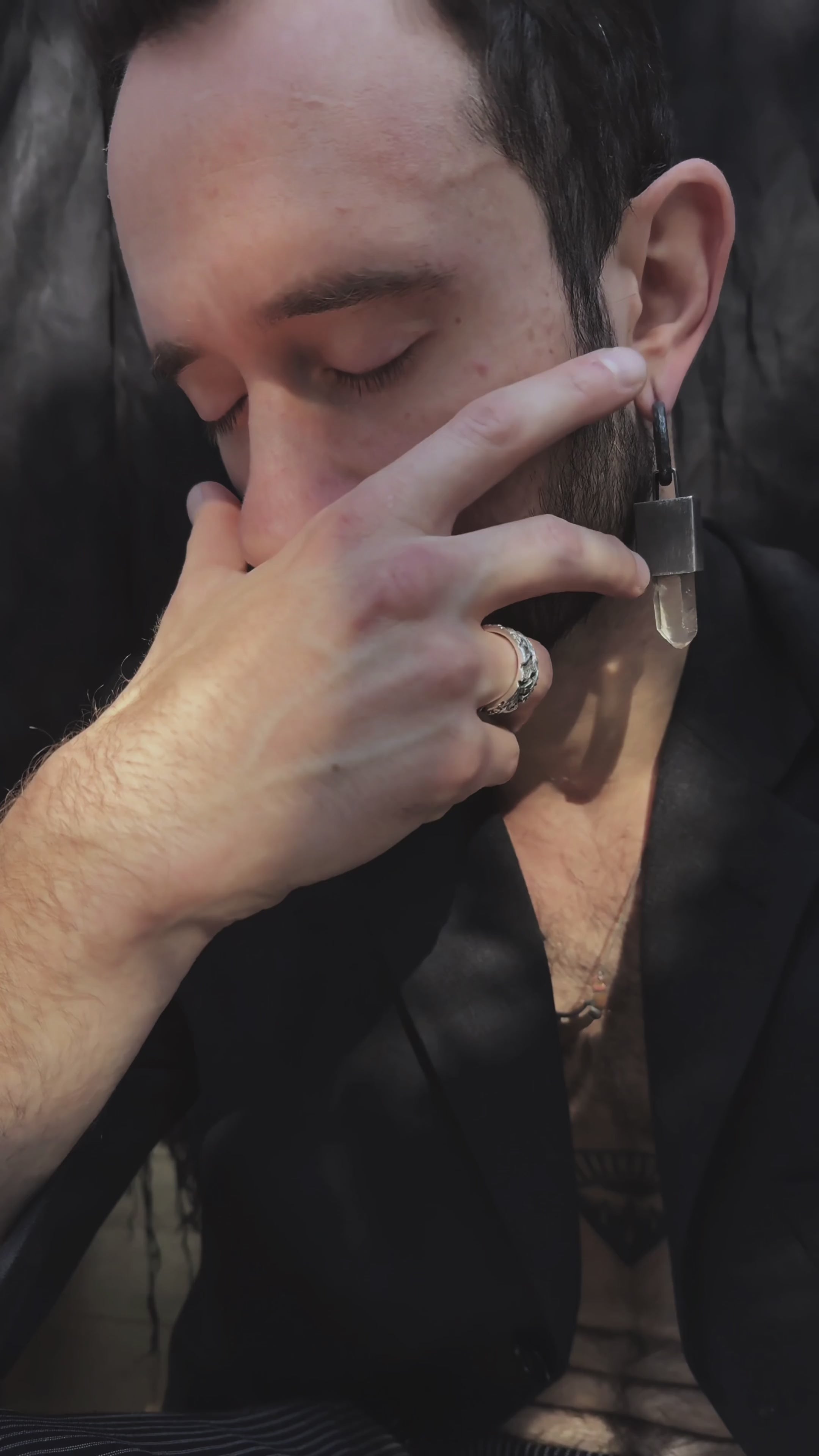 Built as a two-part design, the earrings adapt seamlessly to your mood: wear the hammered hoops alone for a clean, alternative edge, or attach the block pendant for full, architectural impact. The pendant can also be worn on a chain, transforming effortlessly into a statement necklace that carries the same talismanic energy.